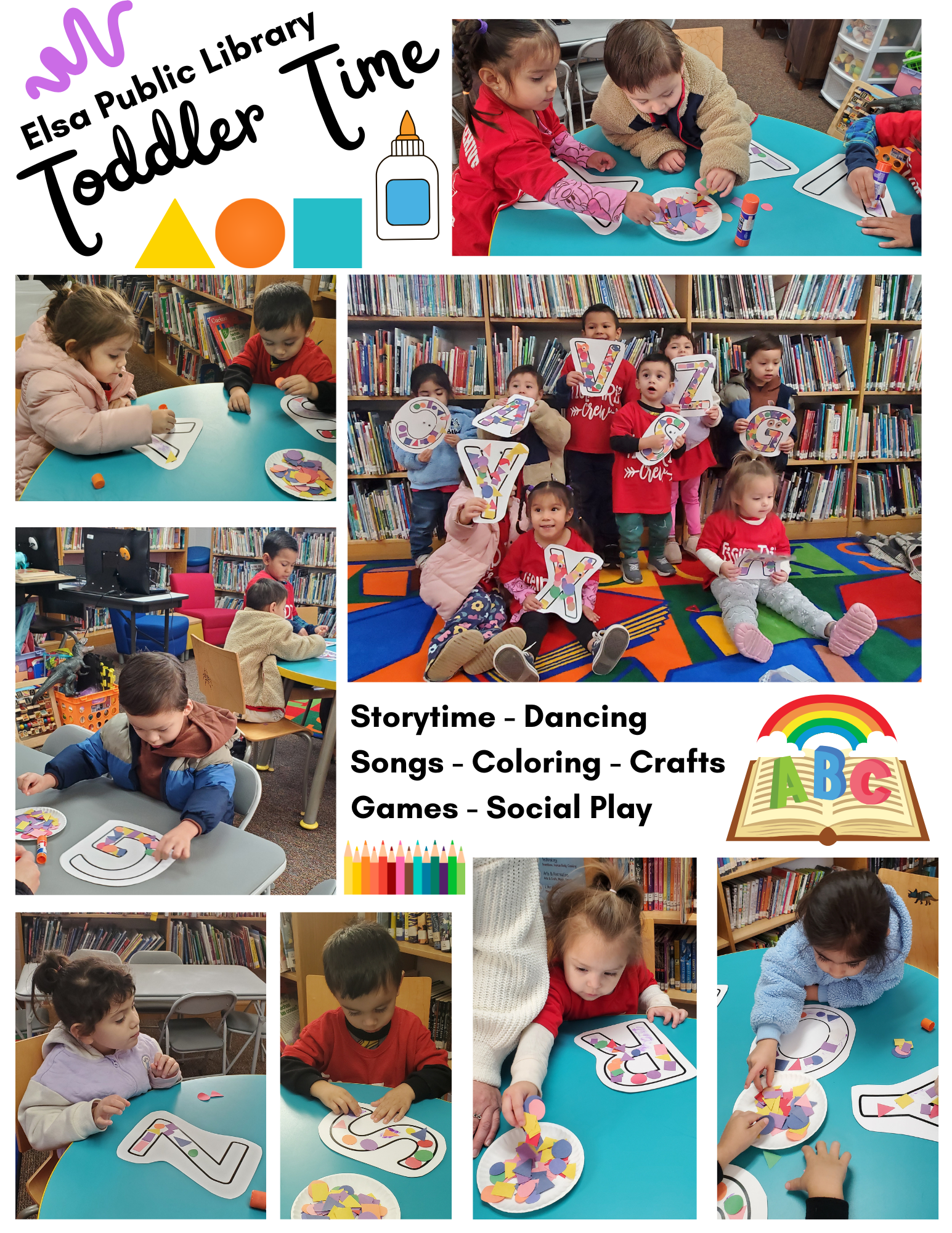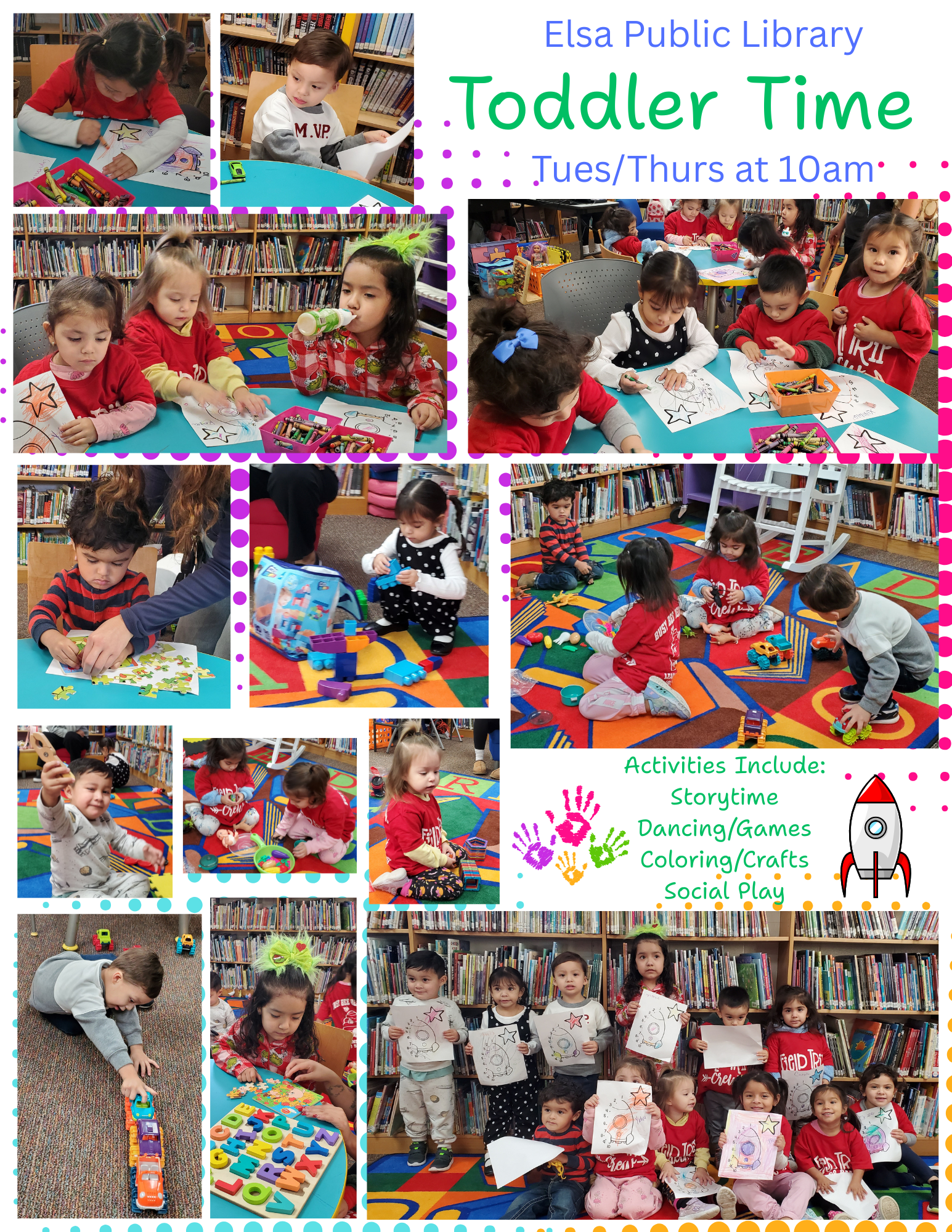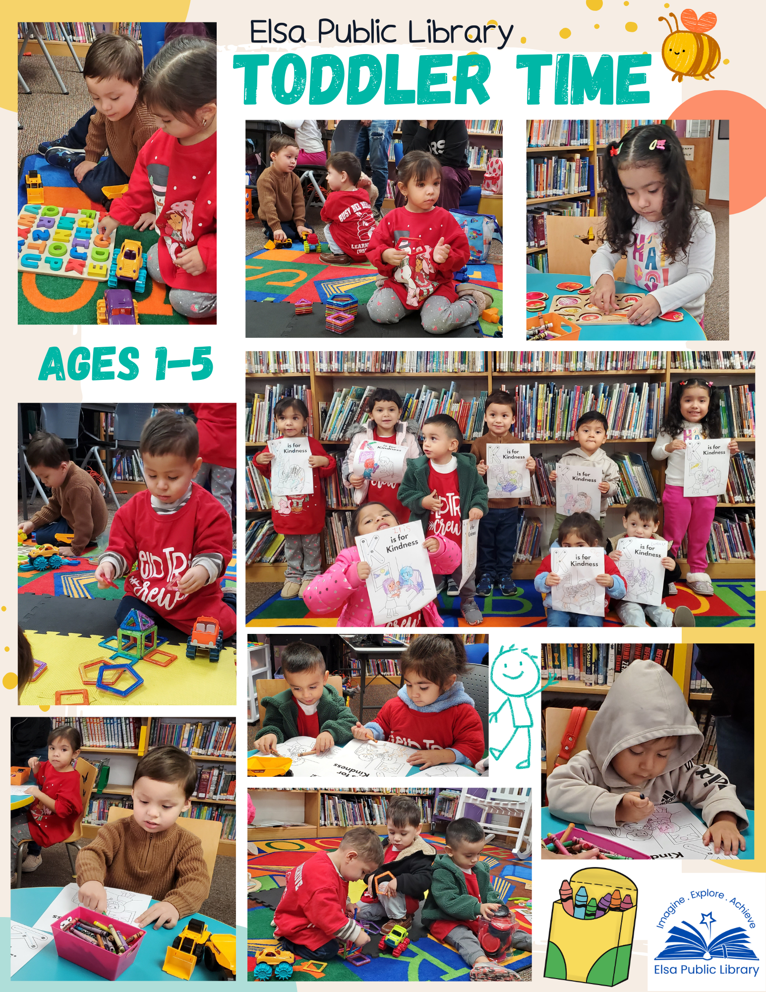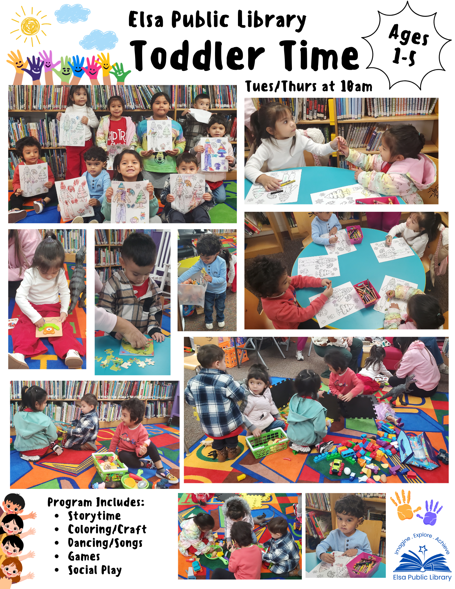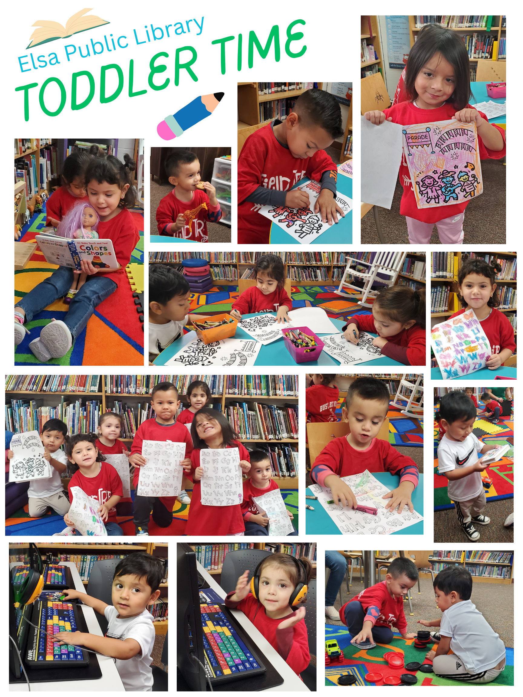 Elsa Public Library offers Toddler Time for children aged 1-5. Fun and engaging activities, featuring Storytime, dancing, games, social play, crafts, coloring activities, and much more.