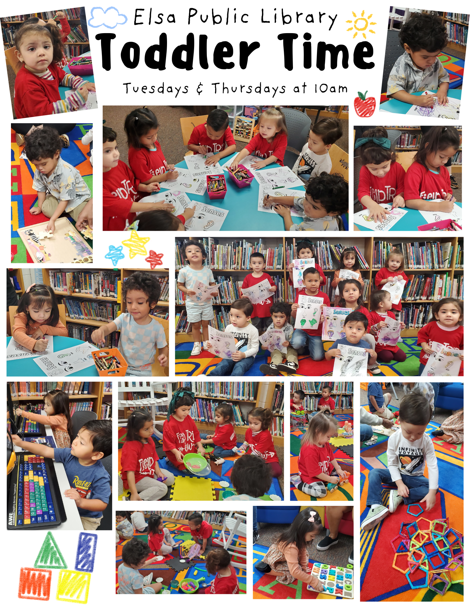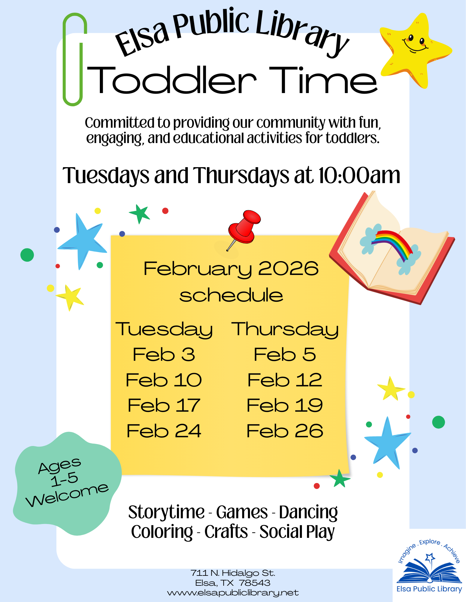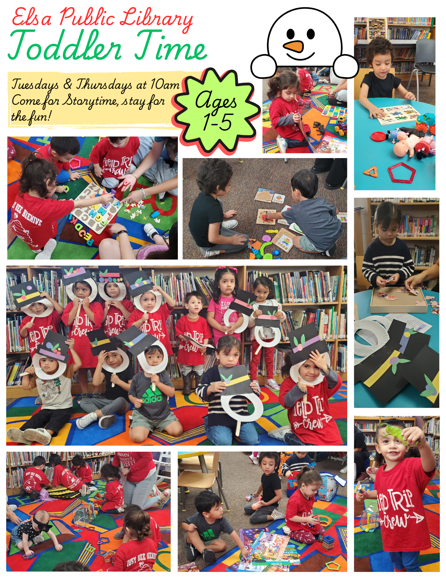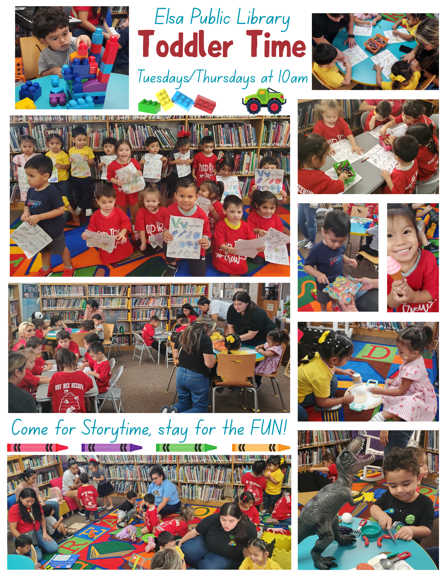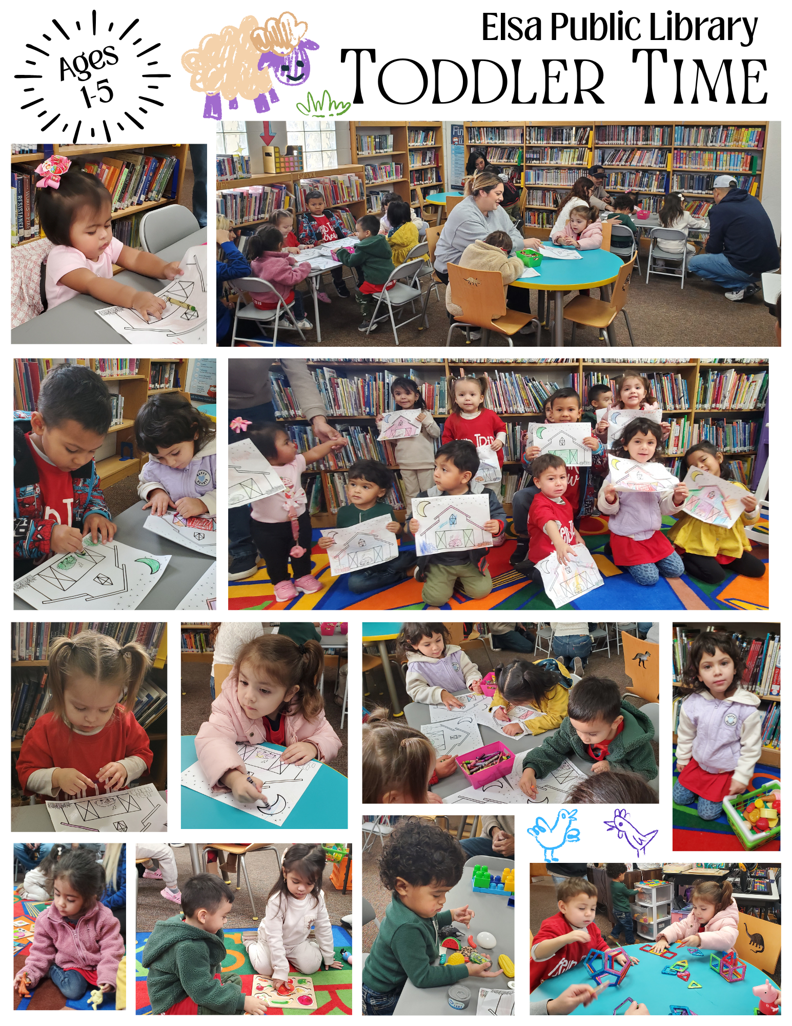 Elsa Public Library offers Toddler Time for children aged 1-5. Fun and engaging activities, featuring Storytime, dancing, games, social play, crafts, coloring activities, and much more.